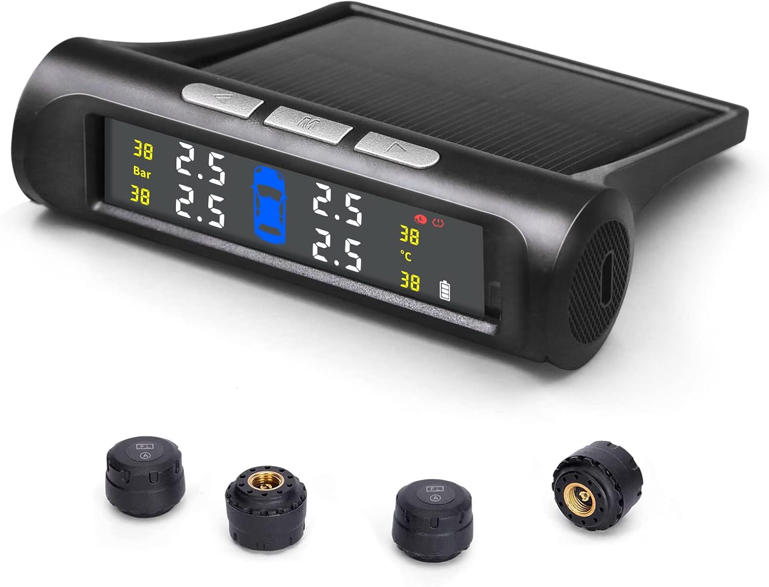 3T6B Wireless TPMS Tire Pressure Monitoring System 5 Alarm Modes, Solar Power and USB Charge with Auto Sleep Mode, LCD Display, 4 TPMS Sensors, Real Time Pressure and Temperature(0~50.75 PSI)