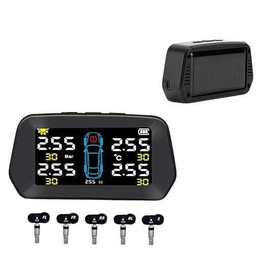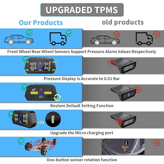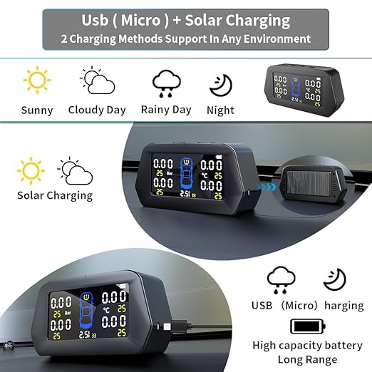 Upgrade Smart TPMS 0.01Bar Accuracy Tyre Pressure Monitoring System Solar Charging 7-Alarm Modes Auto Sleep/Work Tire Position Exchange 5-Built in Sensors (0-116PSI)