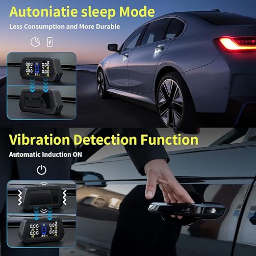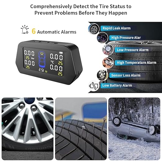 - [ Alarm function ] With 7 alarm functions: tire pressure high alarm, tire pressure low alarm, temperature high alarm, tire rapid air leakage alarm, tire slow air leakage alarm, sensor low battery alarm, sensor signal loss alarm. Multiple safety warning modes make driving safer.