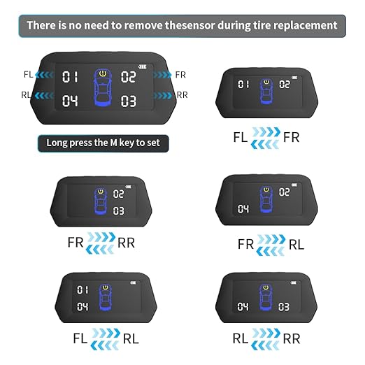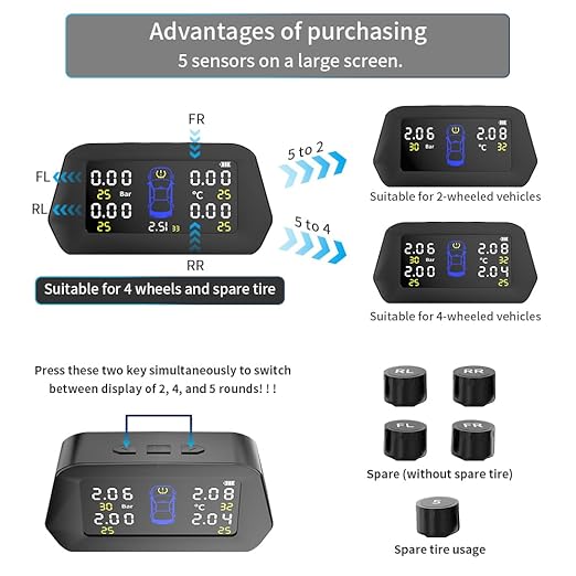 - [ Unique Function ] The display has the function of switching between 2/4/5 wheels and displaying independently. Press the left and right buttons simultaneously to switch between separate display modes for 2/4/5 wheels. The fifth sensor is for spare tire use. With this feature, you can use this device on two wheeled vehicles, four wheeled vehicles, and five wheeled vehicles. Purchase a set of 5 sensors and keep the excess sensors as a backup.